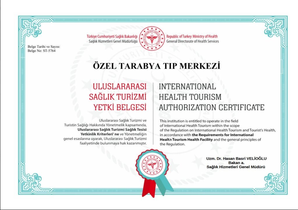 Tesisimiz, Uluslararası Sağlık Turizmi ve Turistin Sağlığı Hakkında Yönetmelik kapsamında, Uluslararası Sağlık Turizmi Sağlık Tesisi Yetkinlik Kriterleri’ne ve Yönetmeliğin genel esaslarına uyarak, Uluslararası Sağlık Turizmi faaliyetinde bulunmaya hak kazanmıştır.